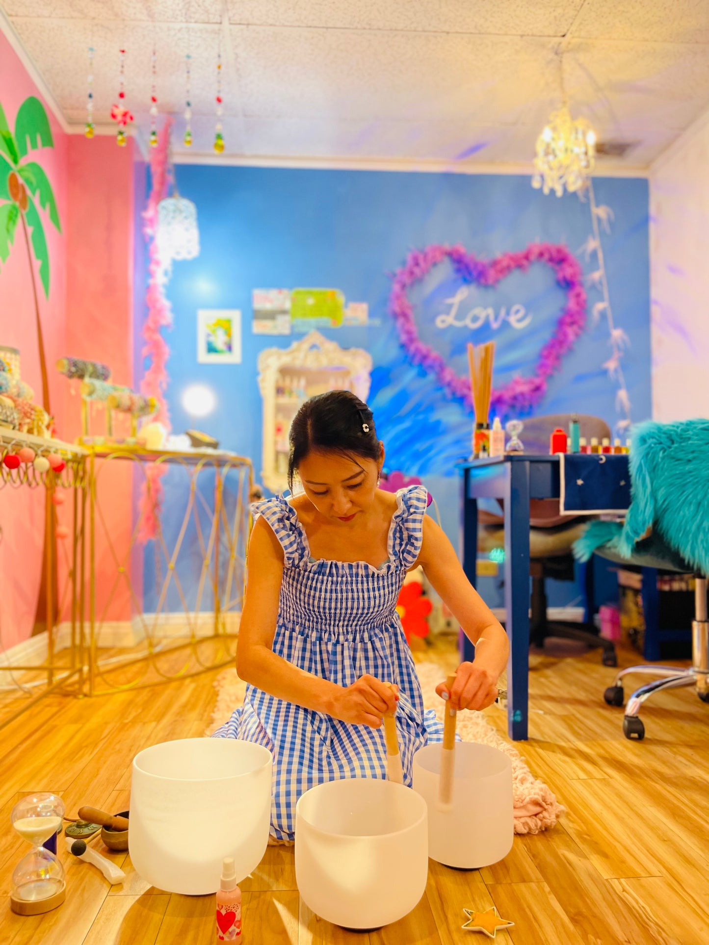 Mari's Salonにて横になって頂き、霊氣とシータヒーリングを掛け合わせてクリスタルとセレナイトのチャクラボール432hzと528hzのものを使用してヒーリングを行います。その後はエンジェルカードを使用しショートリーディングを行います。計15分のヒーリングセッションです(チップは含まれております)