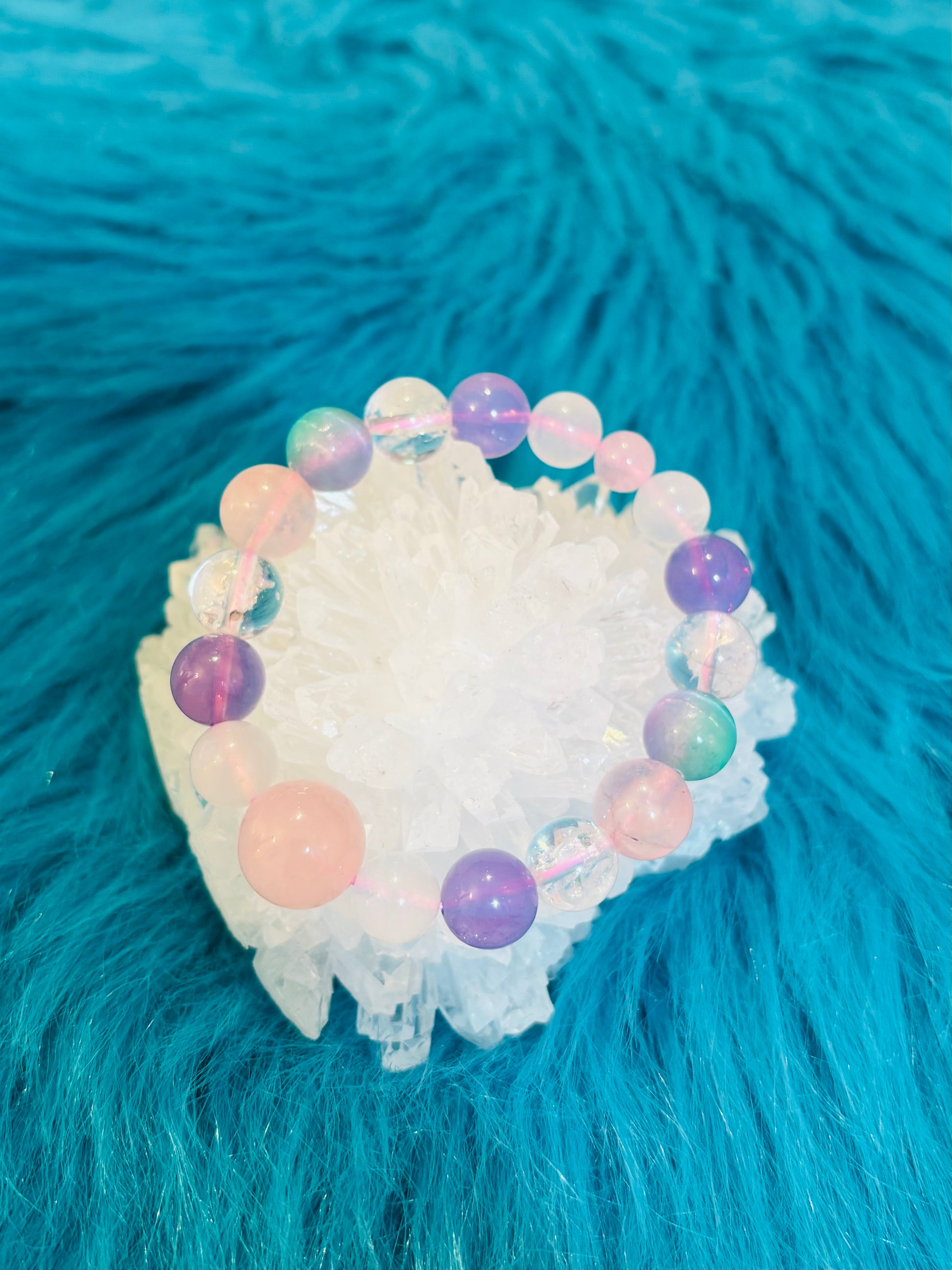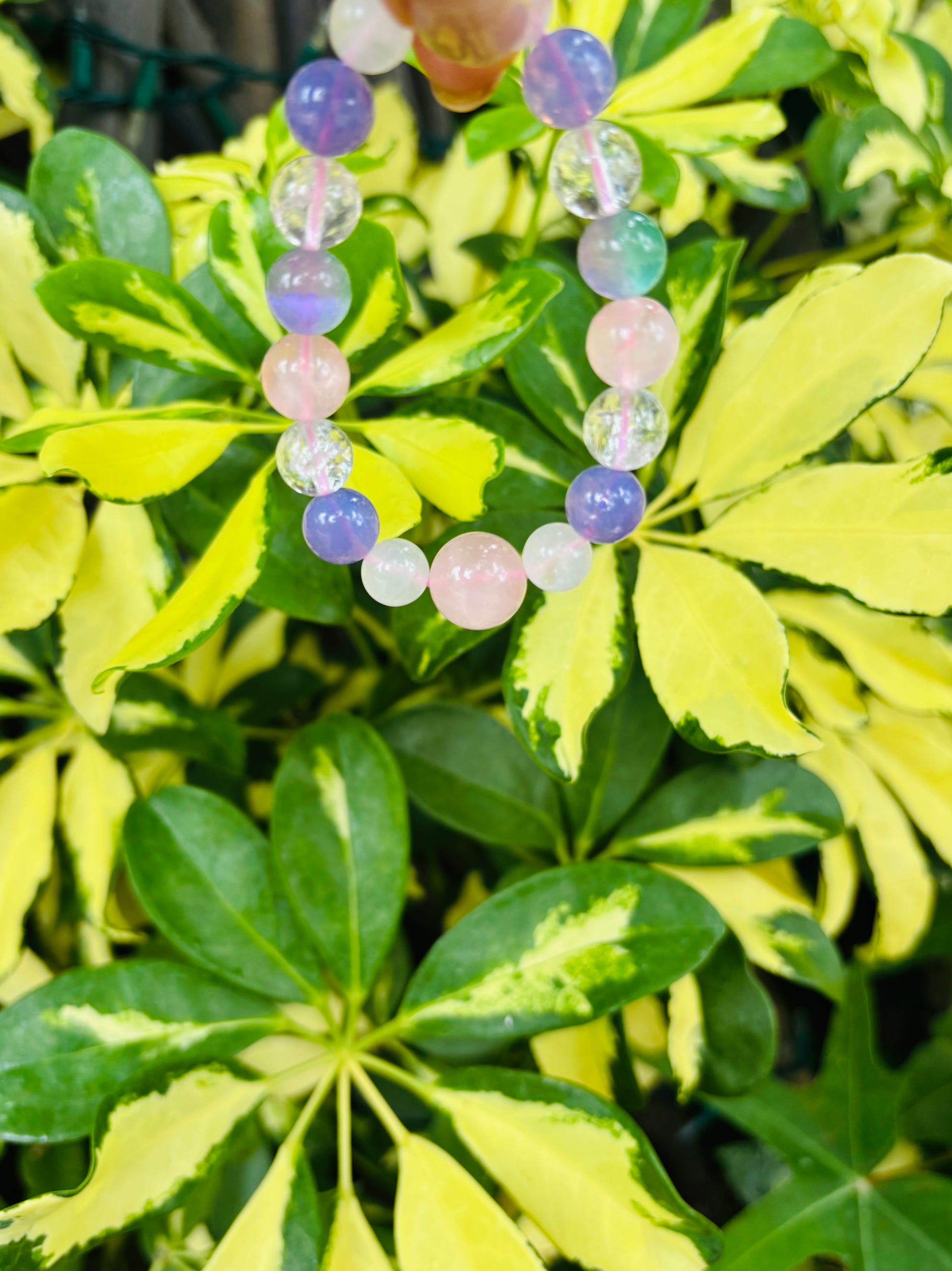 マダガスカルローズクォーツ、レインボームーンストーン、セレナイト、、レインボーローズクォーツ、ラベンダークォーツを使用。