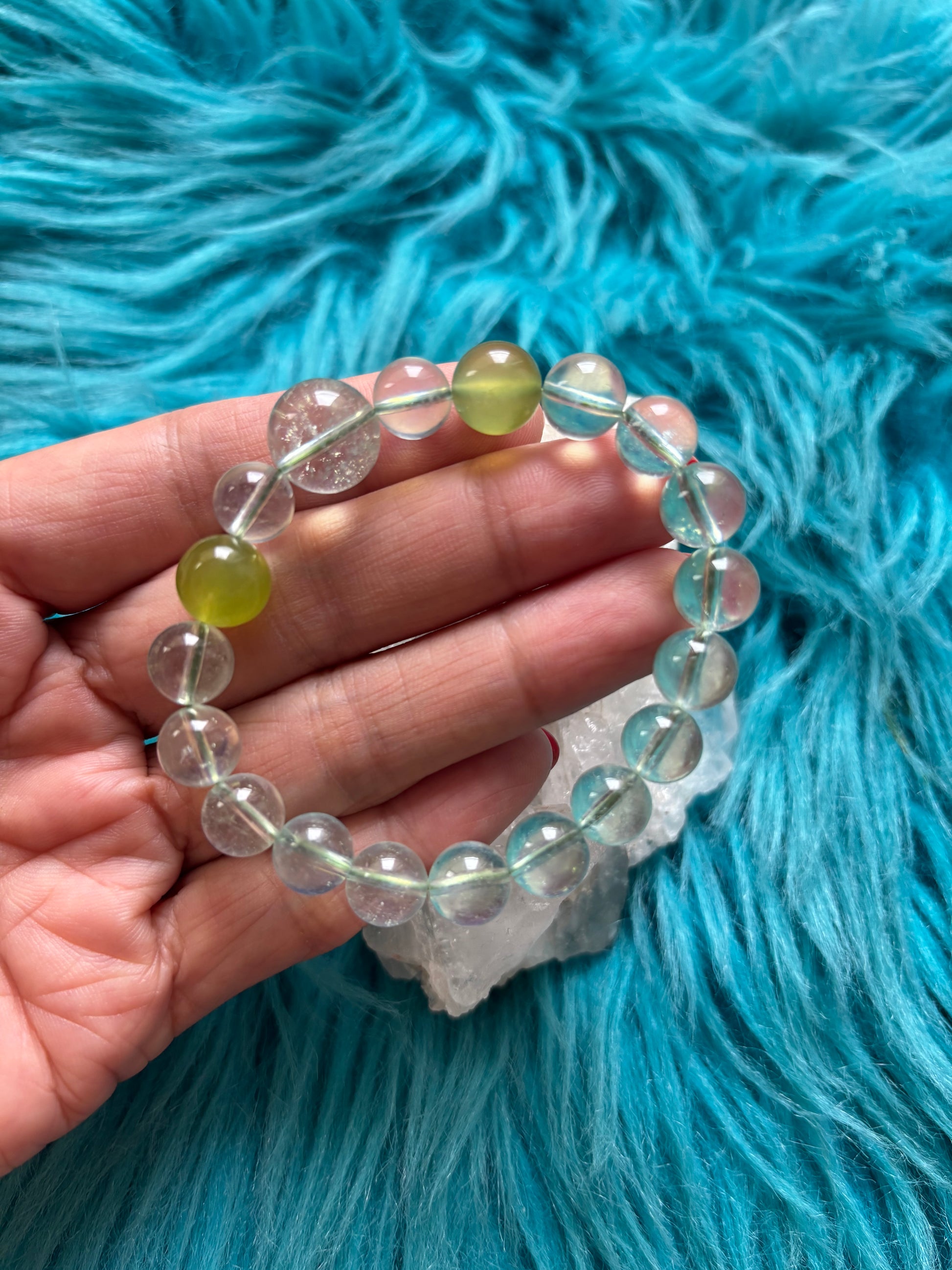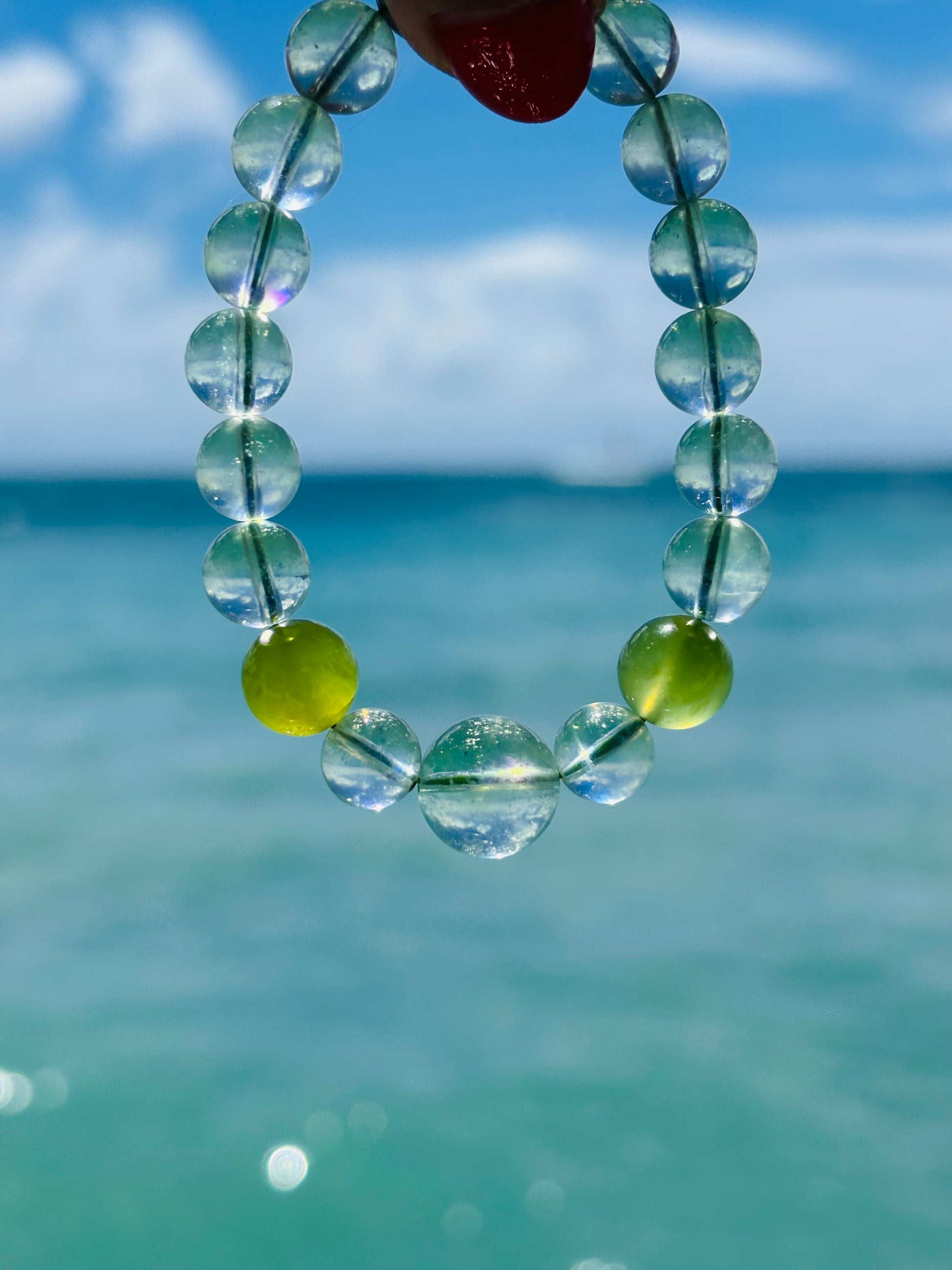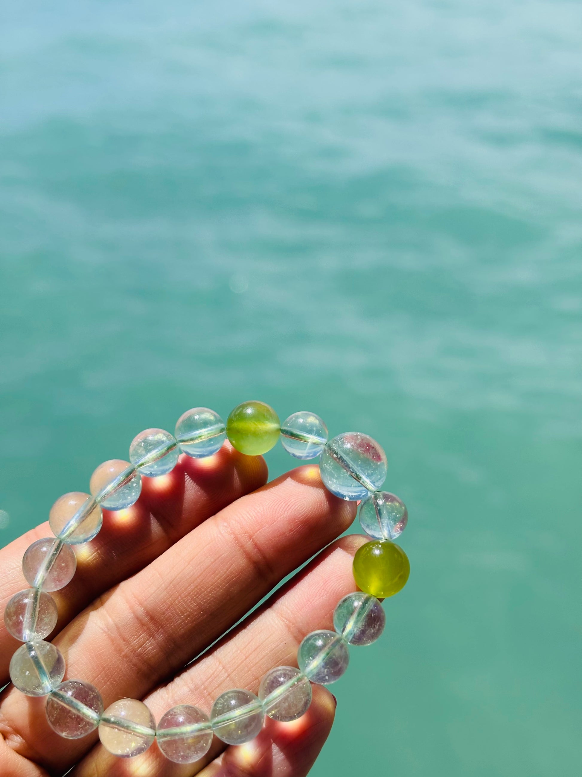 通常のアクアマリンは澄んだ水色〜青色ですが、鉄の含有量や結晶内部の条件によって、ほんのり緑を帯びた柔らかな色合いになることがあります。特に「ミントグリーンアクアマリン」と呼ばれるものは、透明感のあるパステル調のグリーンブルーで、非常に爽やかで珍しい色味です。