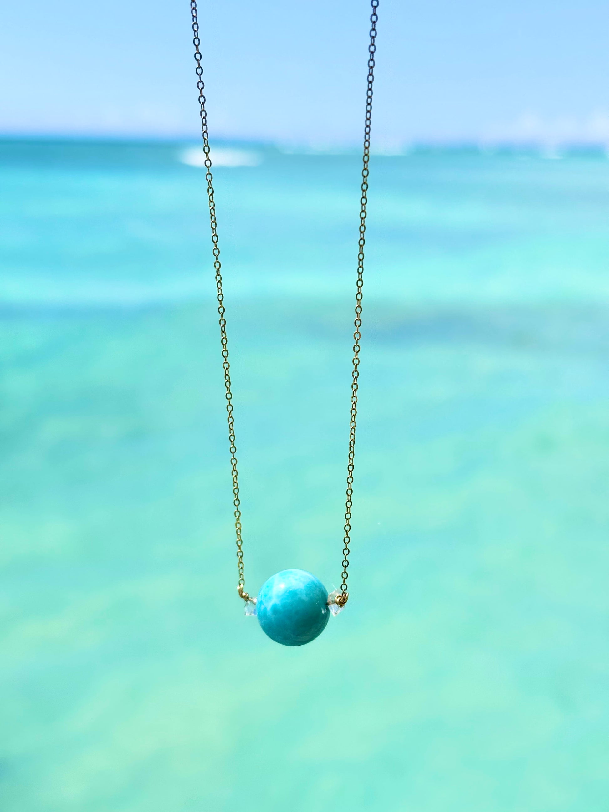 このネックレスはラリマー、ハーキマーダイヤモンド、14金ゴールドフィルドのチェーンとパーツで構成されています。